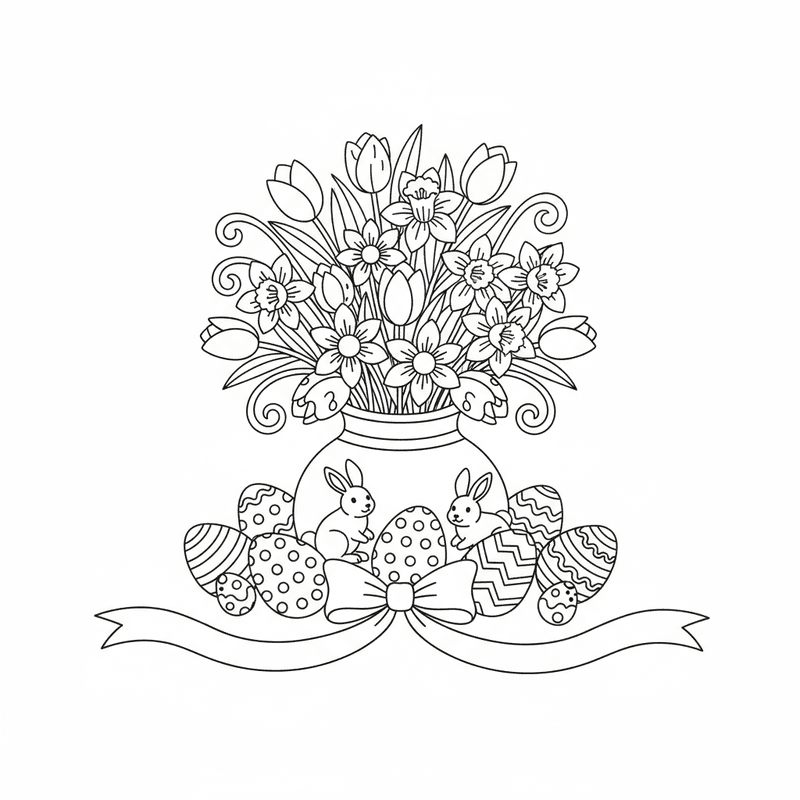 Una deliziosa pagina di Pasqua da colorare con centro tavola pasquale fiori uova. Perfetta per bambini e adulti che amano colorare!