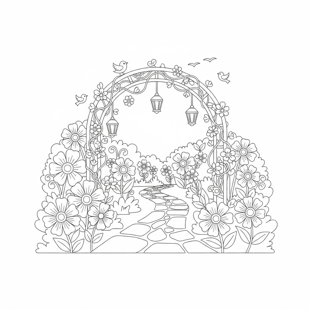 Una deliziosa pagina di fiori da colorare con un sentiero fiorito in giardino e un arco di camminamento. Perfetto per bambini e adulti che amano colorare!