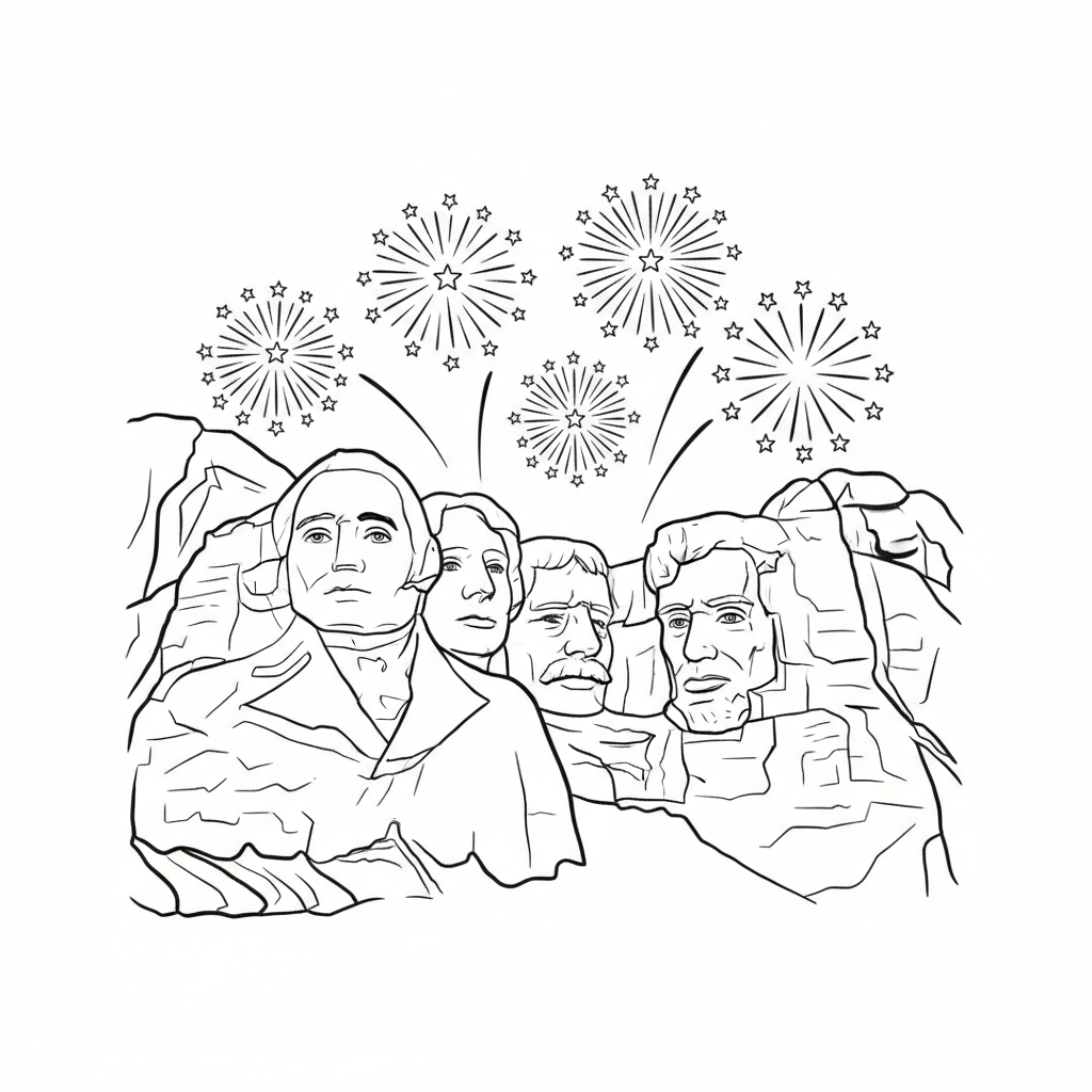 Una deliziosa pagina da colorare per il 4 luglio raffigurante il Monte Rushmore con fuochi d'artificio che esplodono nel cielo. Perfetta per bambini e adulti che amano colorare!