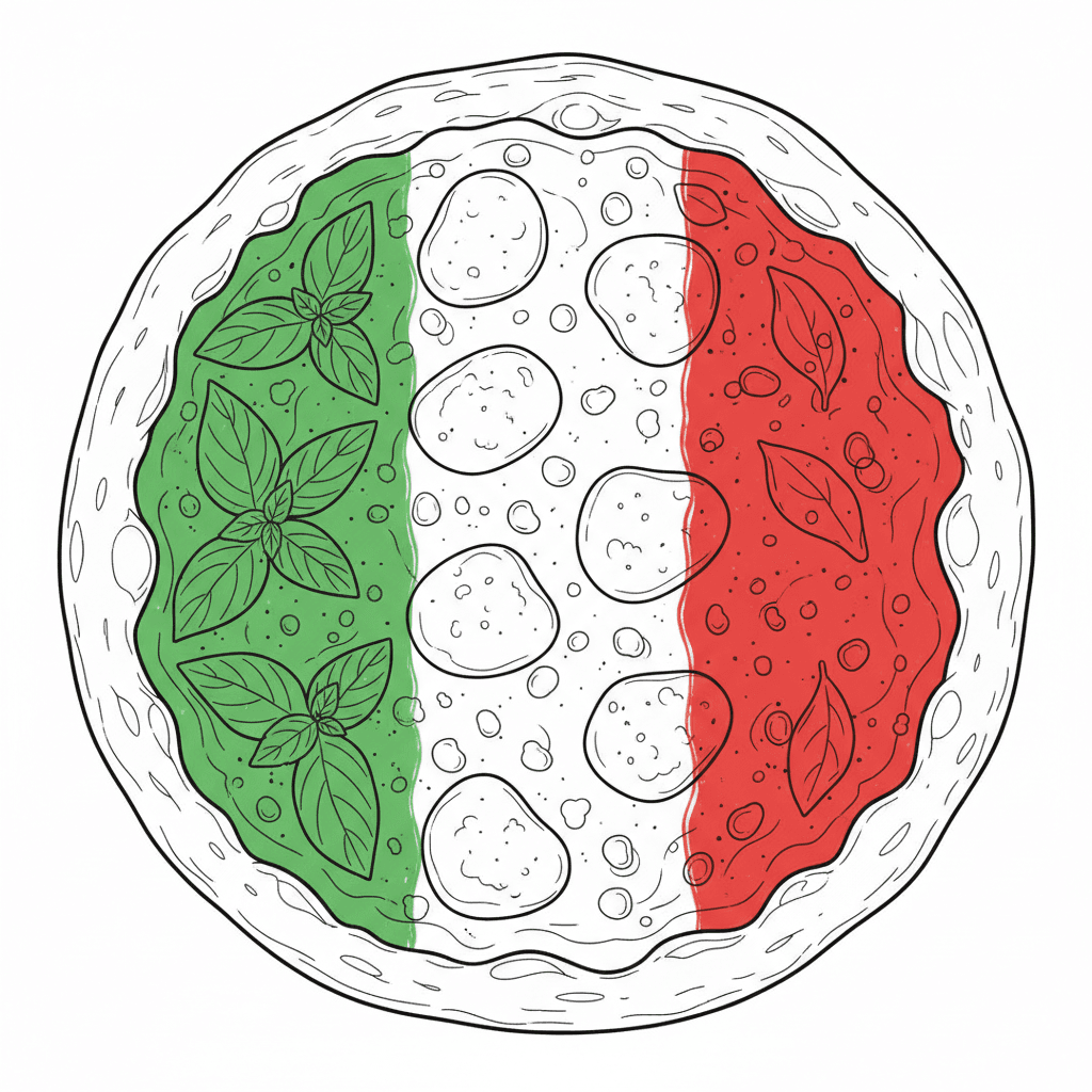 Bella pagina di pizza margherita bandiera italiana da colorare per bambini e adulti. Da scaricare e stampare gratuitamente.