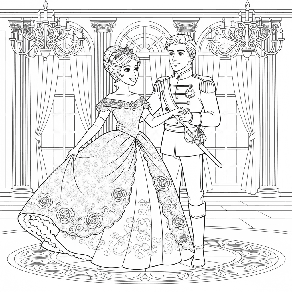 Bella principessa e principe al ballo da colorare per bambini e adulti. Da scaricare e stampare gratuitamente.