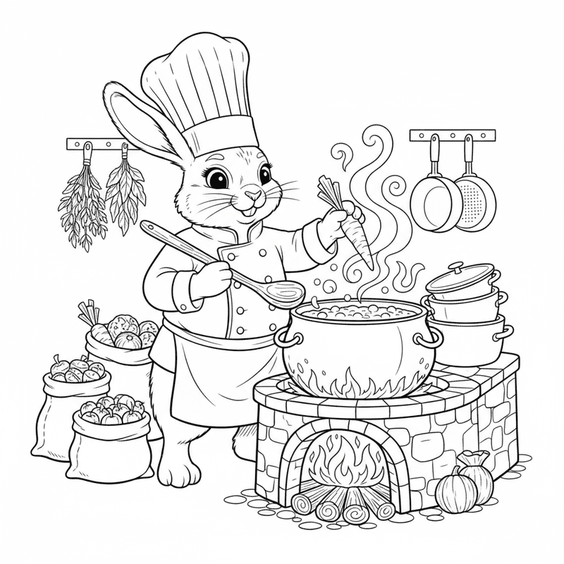 Bellissimo coniglio chef che cucina lo stufato da colorare per bambini e adulti. Da scaricare e stampare gratuitamente.