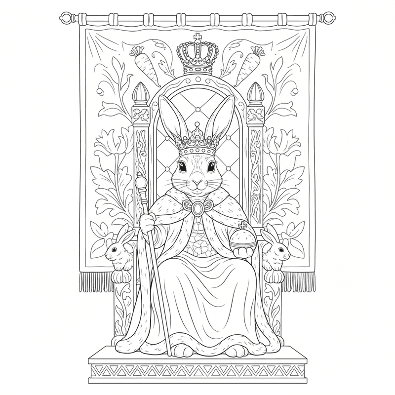 Bellissima pagina da colorare di Re coniglio in trono per bambini e adulti. Da scaricare e stampare gratuitamente.