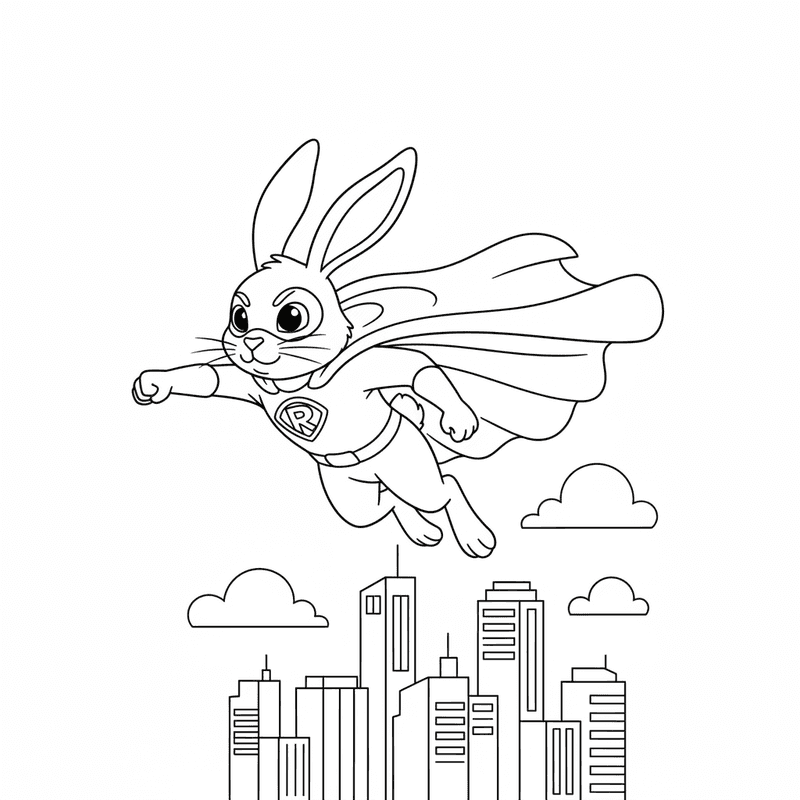 Bella pagina da colorare di coniglio supereroe con mantello volante per bambini e adulti. Da scaricare e stampare gratuitamente.