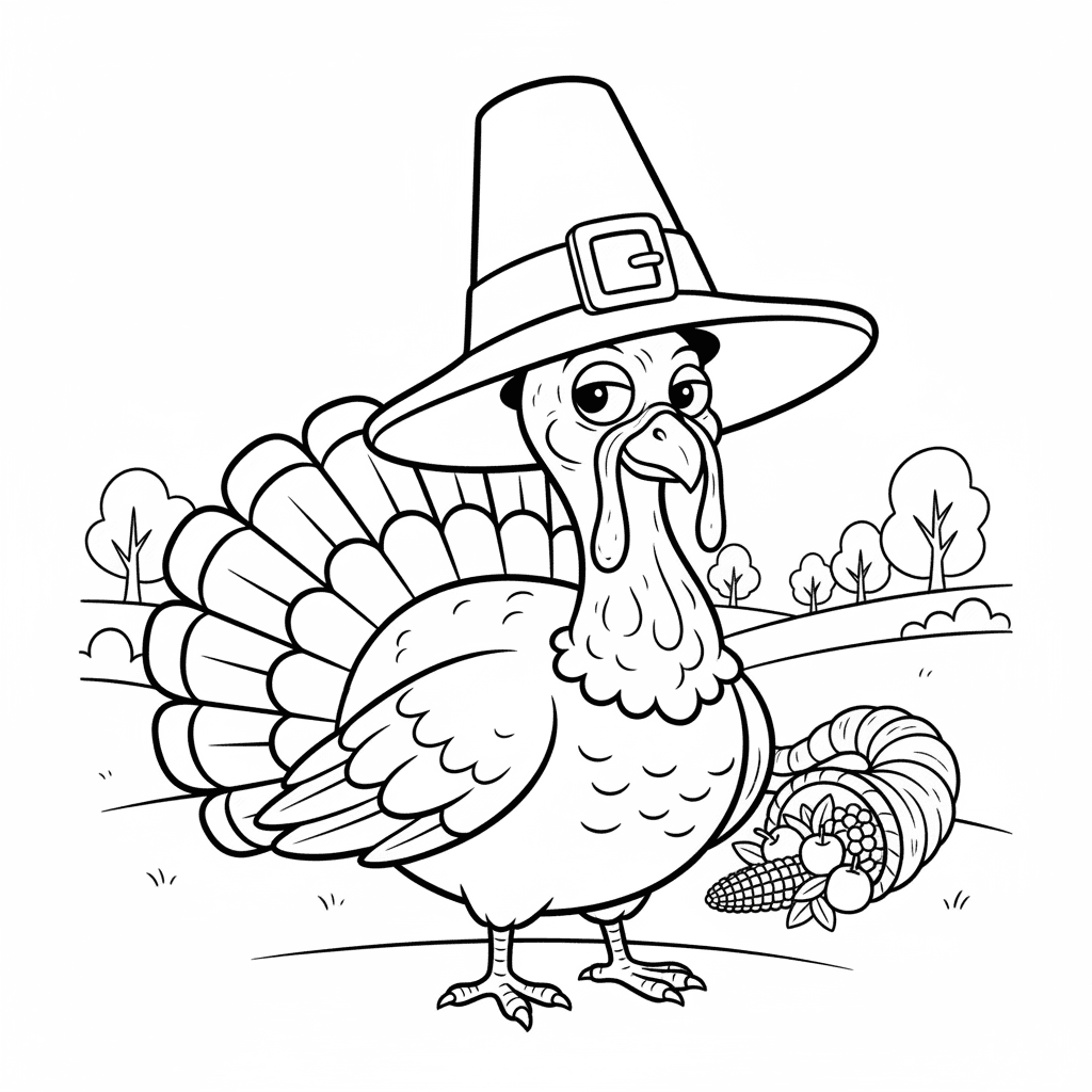 Bellissimo tacchino con cappello da pellegrino divertente pagina da colorare per bambini e adulti. Da scaricare e stampare gratuitamente.