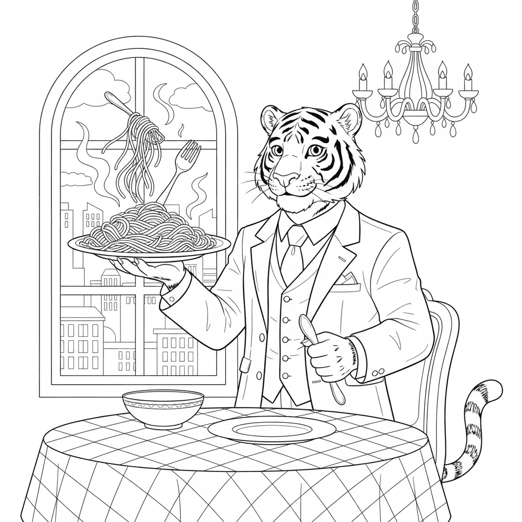 Una tigre adolescente in giacca e cravatta che serve spaghetti