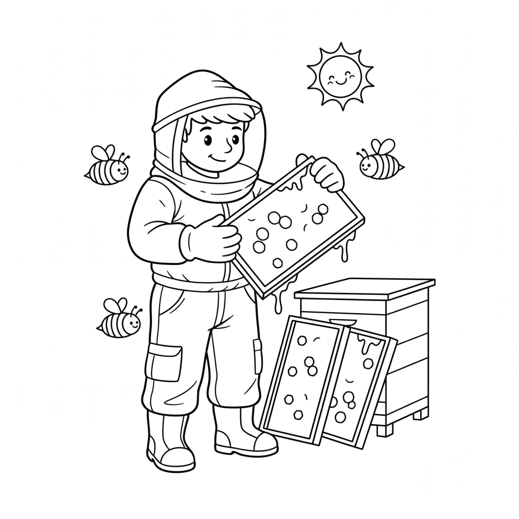 Een prachtige bijenkleurplaat met een imker in een beschermend pak die aan het oogsten is. Perfect voor kinderen en volwassenen die van kleuren houden!