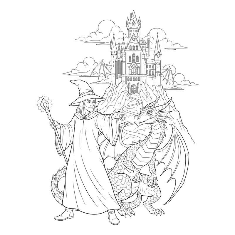 Een tovenaar kijkt naar een tovenaarsschool met getrokken toverstok en naast een draak