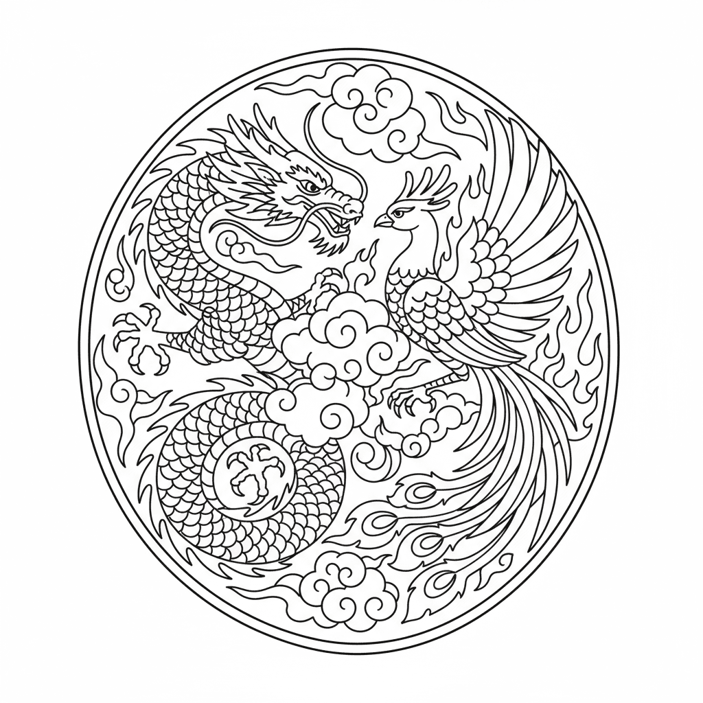 Een prachtige kleurplaat met draak en feniks uit de mythologie. Perfect voor kinderen en volwassenen die van kleuren houden!