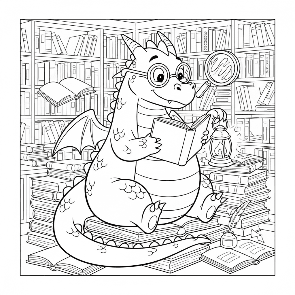 Een prachtige drakenkleurplaat met een boekenwurm als draak en een leesbril. Perfect voor kinderen en volwassenen die van kleuren houden!