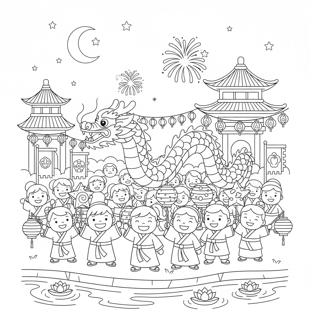 Een prachtige drakenkleurplaat met de viering van de nacht van het drakenfestival. Perfect voor kinderen en volwassenen die van kleuren houden!