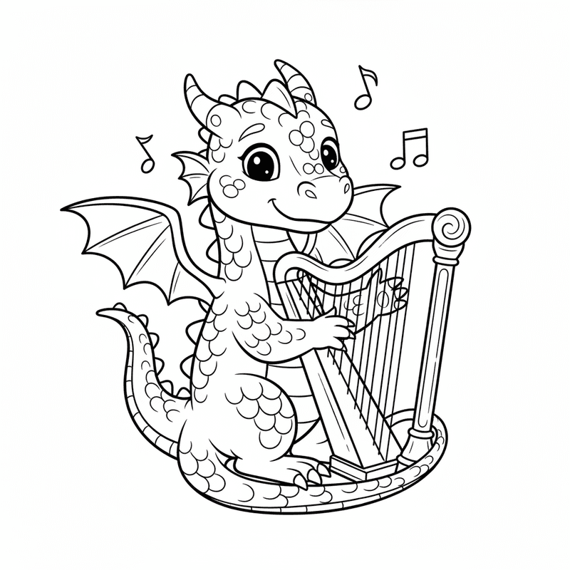 Een prachtige drakenkleurplaat met een draak die melodieus harp speelt. Perfect voor kinderen en volwassenen die van kleuren houden!
