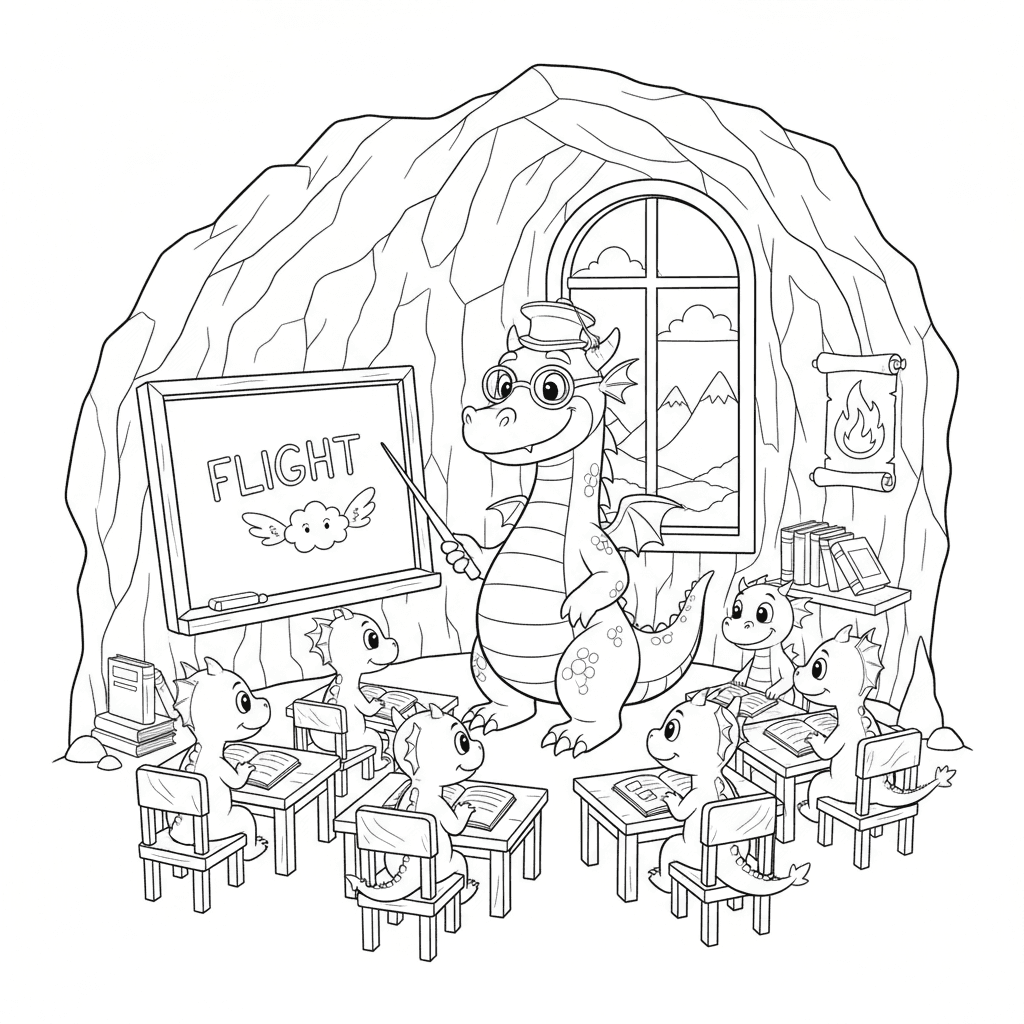Een prachtige kleurplaat met draken die les geven aan jonge draken. Perfect voor kinderen en volwassenen die van kleuren houden!