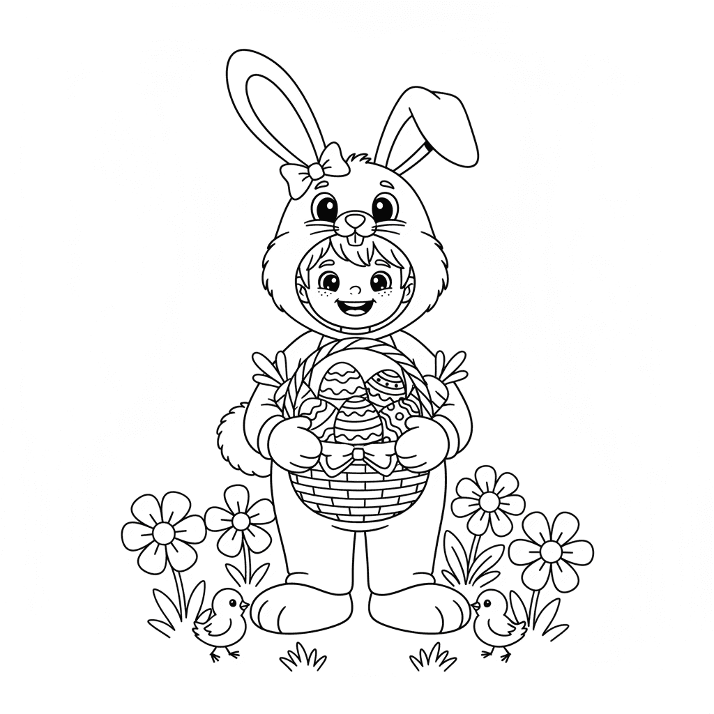 Een prachtige paaskleurplaat met een paashaaskostuum dat een kind draagt. Perfect voor kinderen en volwassenen die van kleuren houden!