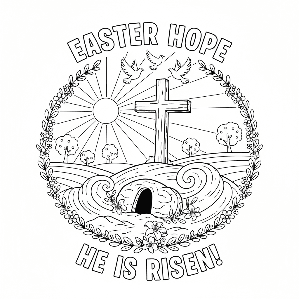 Een prachtige paaskleurplaat met de zonsopgang van een paaskruis. Perfect voor kinderen en volwassenen die van kleuren houden!
