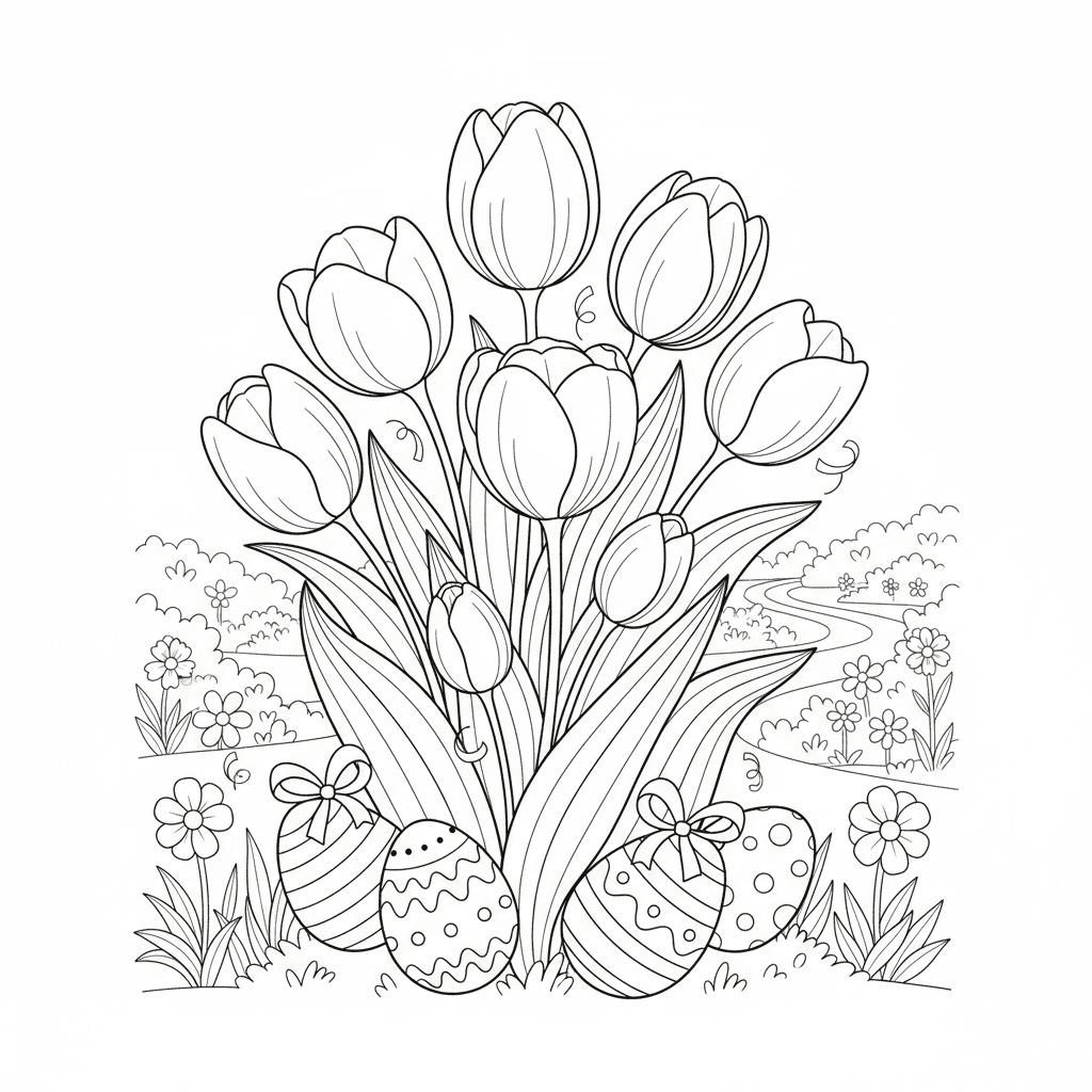 Mooie paastuin tulpen in bloei kleurplaat voor kinderen en volwassenen. Gratis downloaden en afdrukken.