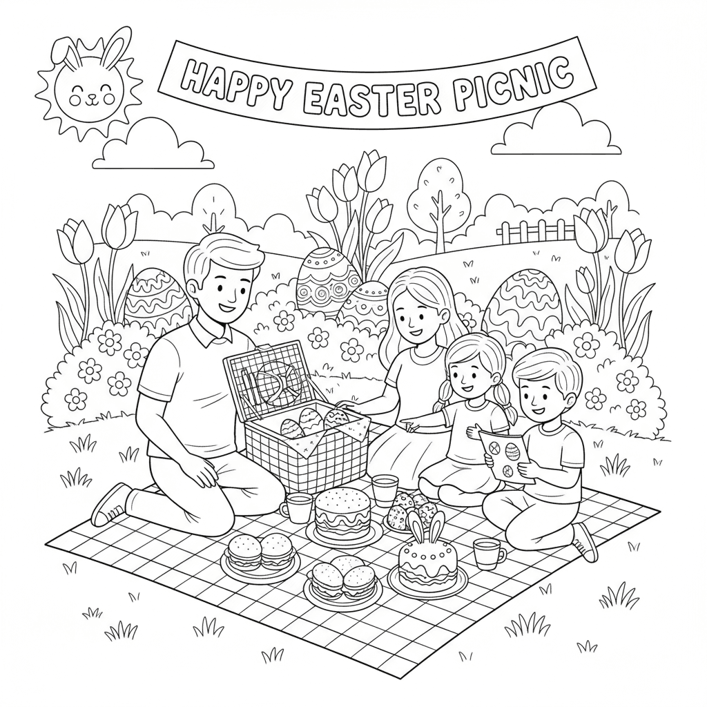 Een prachtige paaskleurplaat met een paaspicknick in de buitenlucht. Perfect voor kinderen en volwassenen die van kleuren houden!