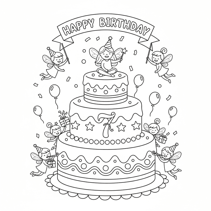 Een schattige kleurplaat met een feeënverjaardagstaart. Perfect voor kinderen en volwassenen die van kleuren houden!