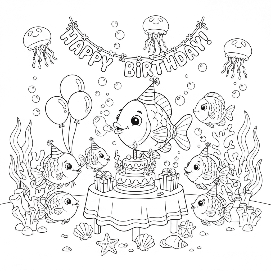 Een schattige kleurplaat met een onderwaterfeestje ter ere van een vissenverjaardag. Perfect voor kinderen en volwassenen die van kleuren houden!