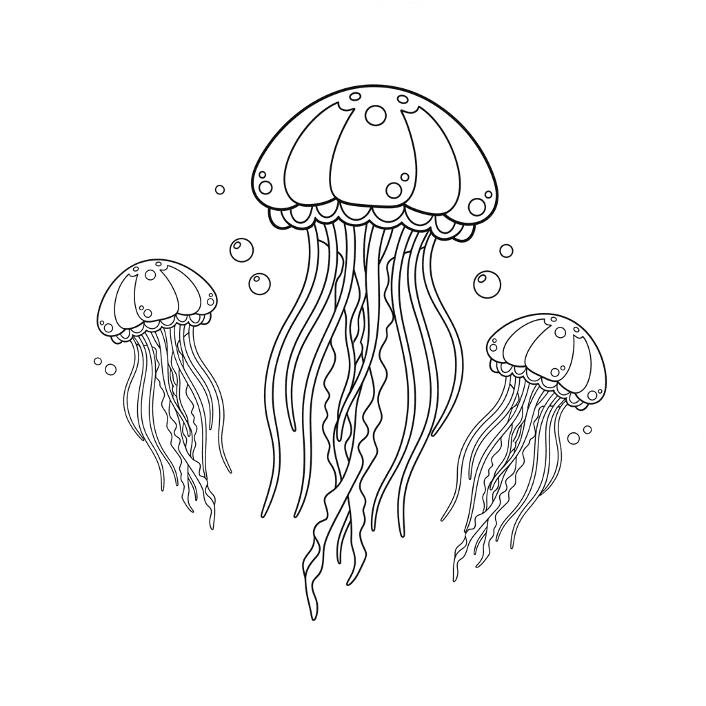 Een prachtige vis kleurplaat met kwallen die sierlijk zweven in een transparante gloed. Perfect voor kinderen en volwassenen die van kleuren houden!
