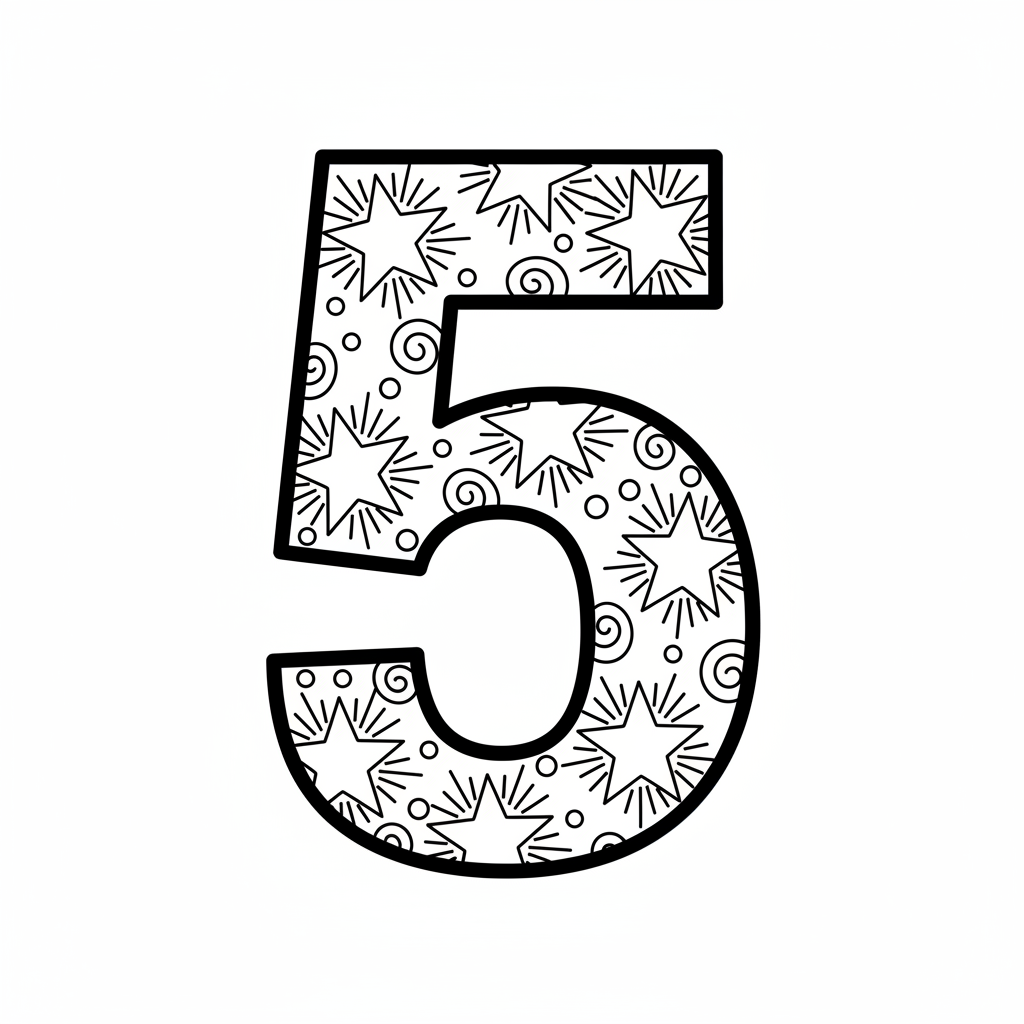 Een prachtige kleurplaat met het cijfer 5, versierd met vijf glinsterende sterren. Perfect voor kinderen en volwassenen die van kleuren houden!