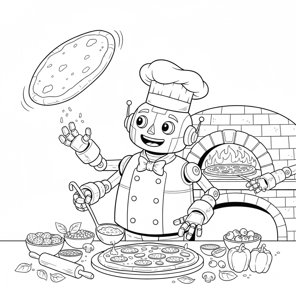 Mooie pizza robot chef-kok kleurplaat voor kinderen en volwassenen. Gratis downloaden en afdrukken.