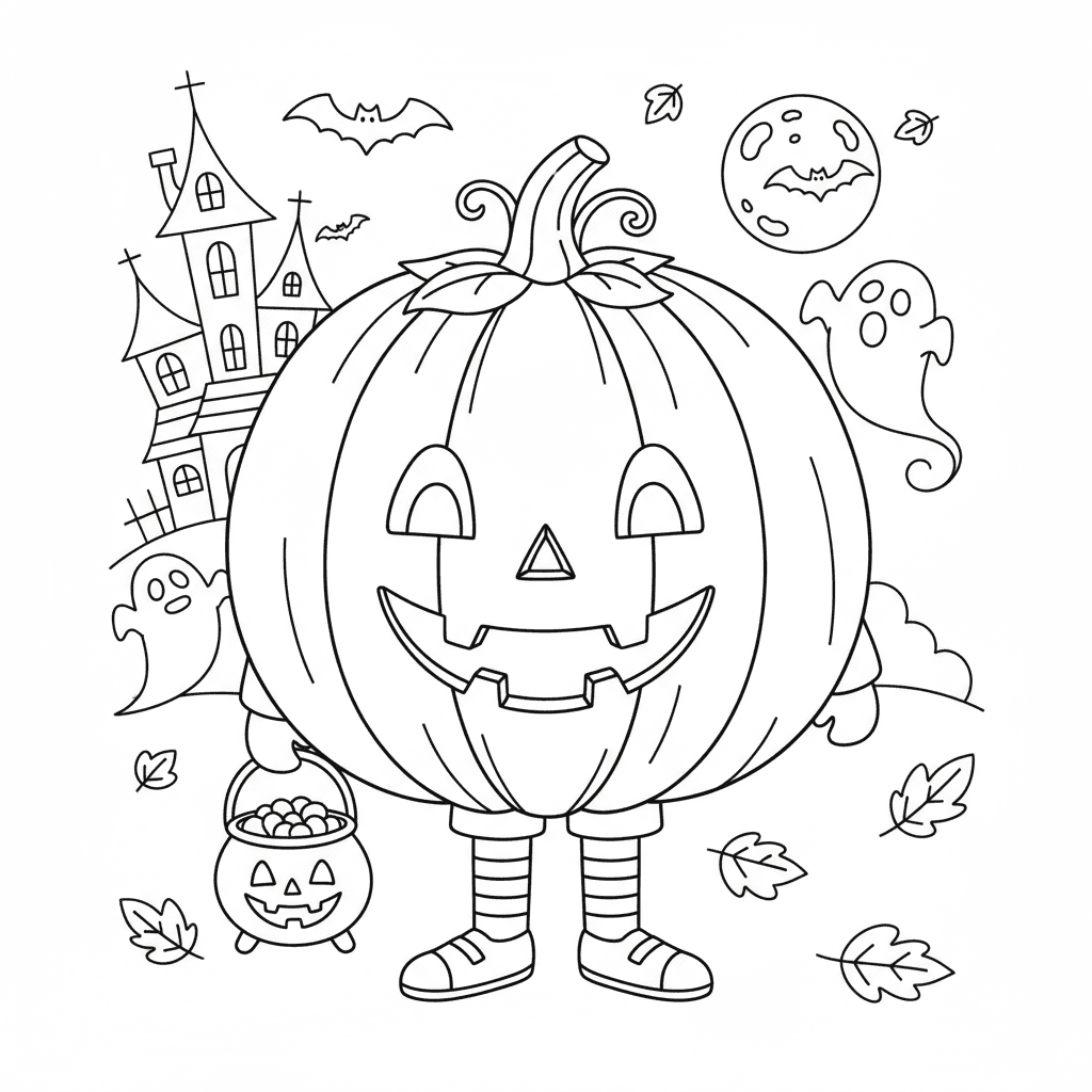 Mooie Halloween-kleurplaat met pompoenkostuum voor kinderen en volwassenen. Gratis downloaden en afdrukken.