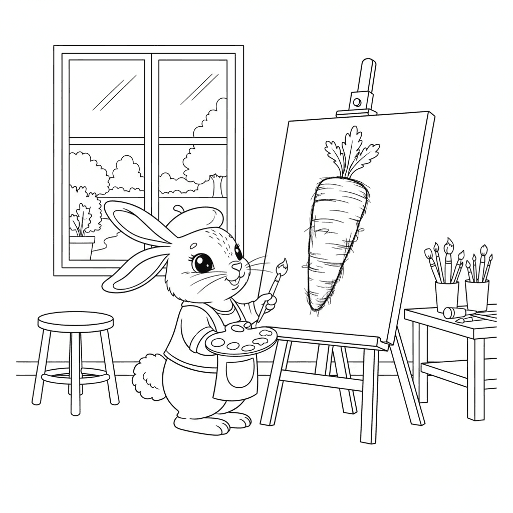 Mooie konijn kunstenaar schilderij wortel kleurplaat voor kinderen en volwassenen. Gratis downloaden en afdrukken.