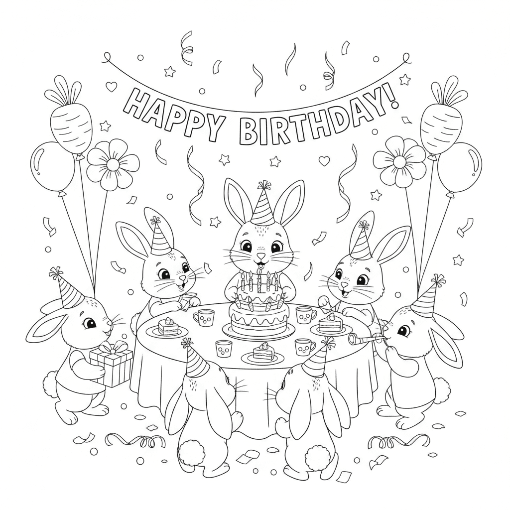 Mooie konijn verjaardagsfeestje kleurplaat voor kinderen en volwassenen. Gratis downloaden en afdrukken.