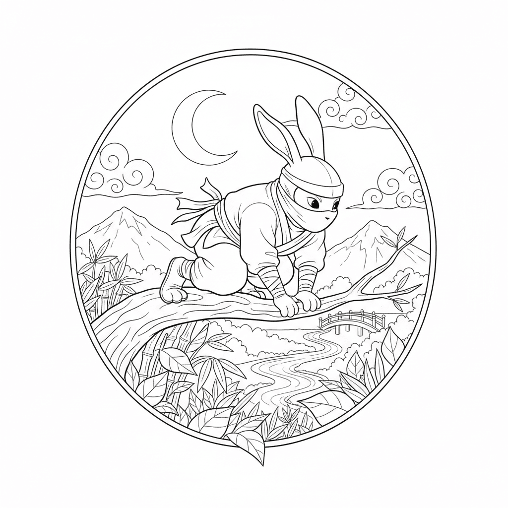 Mooie konijn ninja stealth kleurplaat voor kinderen en volwassenen. Gratis downloaden en afdrukken.