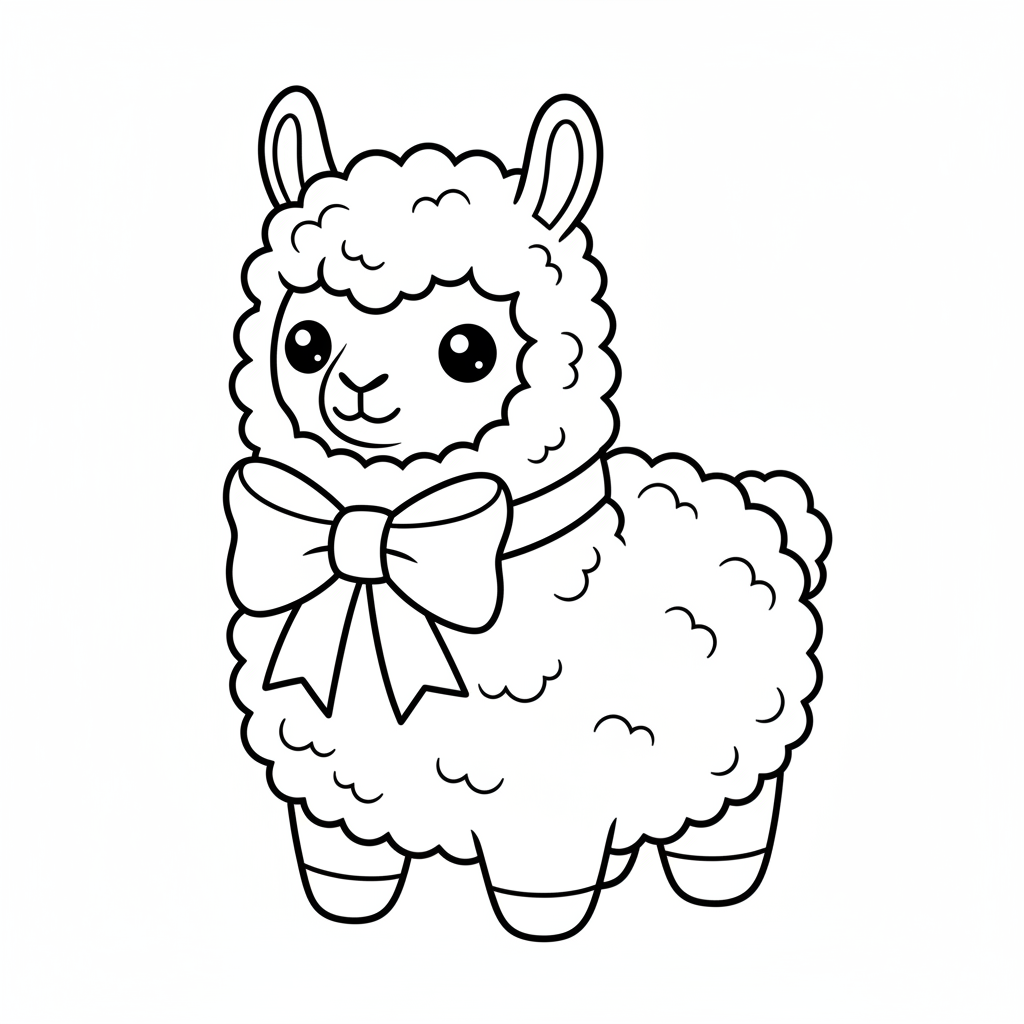 Een originele AI-gegenereerde fan art kleurplaat geïnspireerd door squishmallow, met een schattig pluche lama-karakter met pluizige wol en strik. Dit is onofficiële fan art, niet verbonden met de originele makers. Perfect voor kinderen en volwassenen die van kleuren houden!