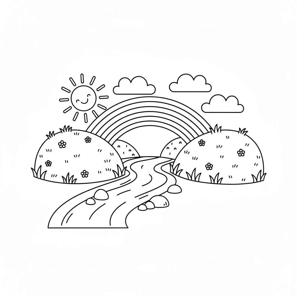 Een prachtige kleurplaat voor St. Patrick's Day met een regenboogbrug die twee groene, glooiende heuvels met elkaar verbindt. Perfect voor kinderen en volwassenen die van kleuren houden!