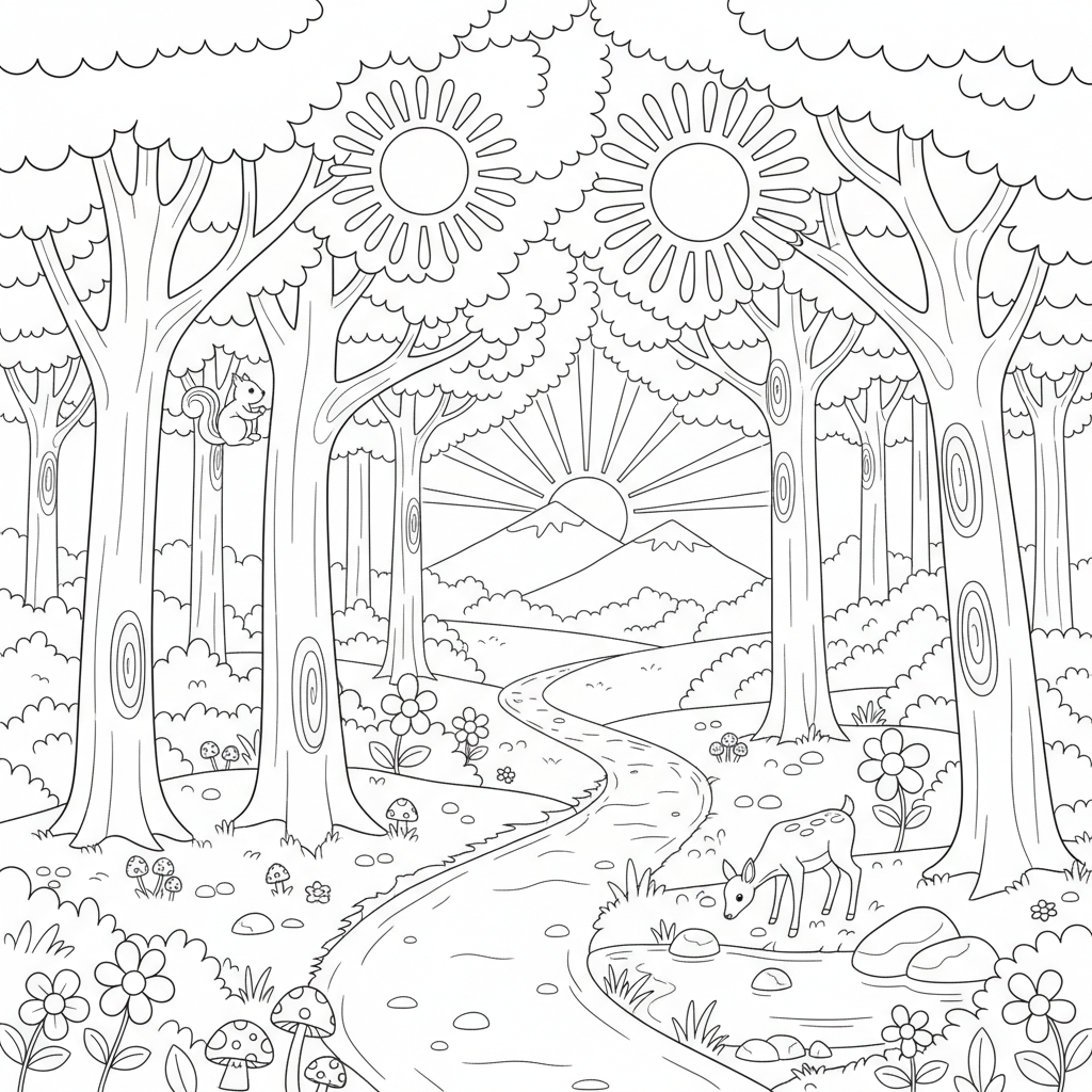 Een heerlijke zomerse kleurplaat met een wandelpad door een zonnig bos. Perfect voor kinderen en volwassenen die van kleuren houden!