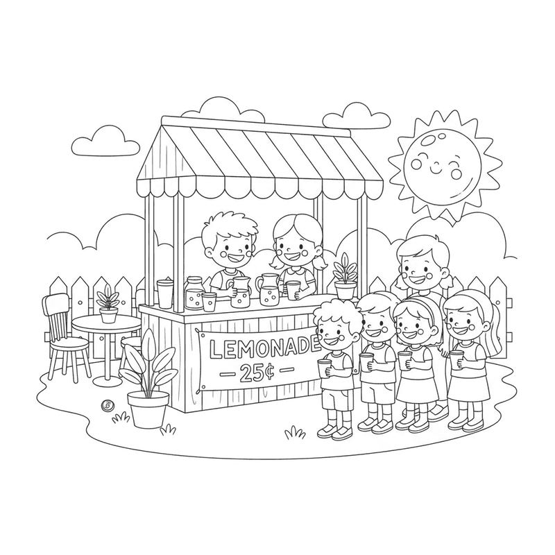 Een vrolijke zomerkleurplaat met een limonadekraam en klanten. Perfect voor kinderen en volwassenen die van kleuren houden!