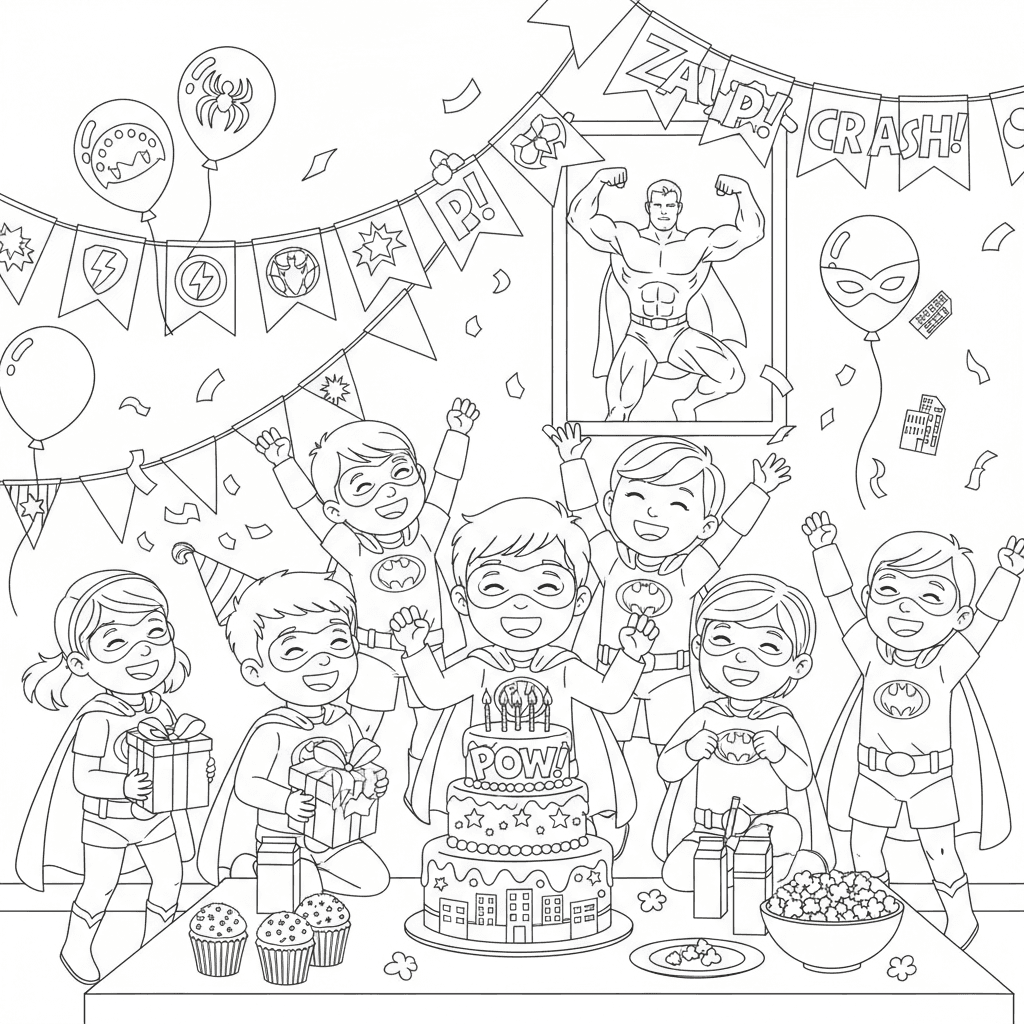 Prachtige superhelden verjaardag kleurplaat voor kinderen en volwassenen. Gratis downloaden en afdrukken.