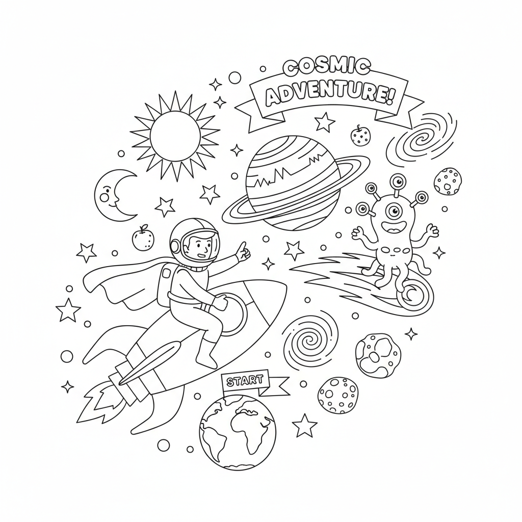 Een fantastische kleurplaat met superhelden die een buitenaards avontuur beleven in de ruimte. Perfect voor kinderen en volwassenen die van kleuren houden!