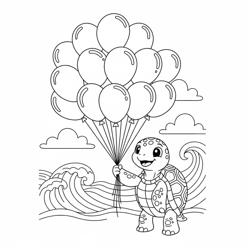 Een schildpad die een bos ballonnen vasthoudt.