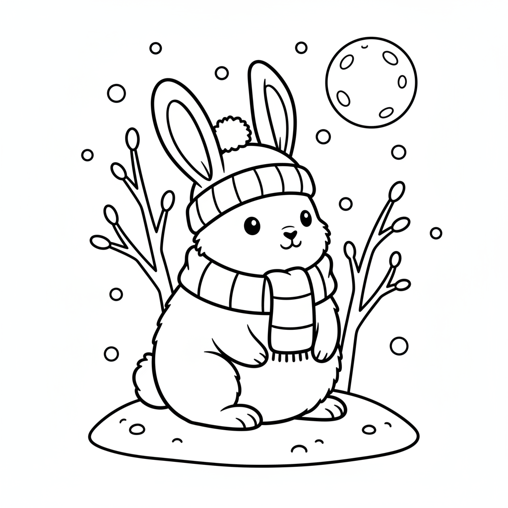 Een prachtige winterkleurplaat met een konijntje in winterse sneeuwwitte vacht. Perfect voor kinderen en volwassenen die van kleuren houden!
