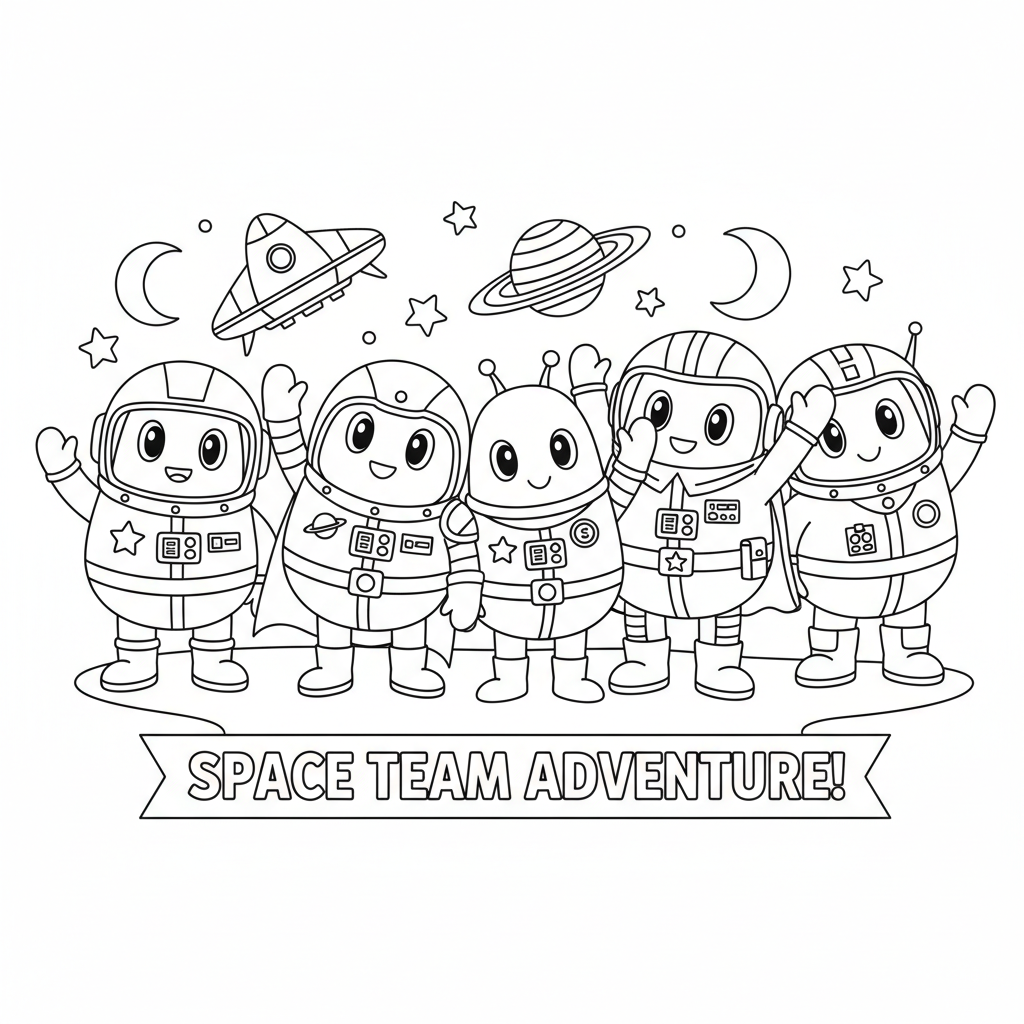 En original AI-genererad fan art-målarbok inspirerad av Among Us, med en grupp färgglada bönformade rymdbesättningsmedlemmar som står tillsammans. Detta är inofficiell fan art, inte ansluten till de ursprungliga skaparna. Perfekt för barn och vuxna som älskar att färglägga!