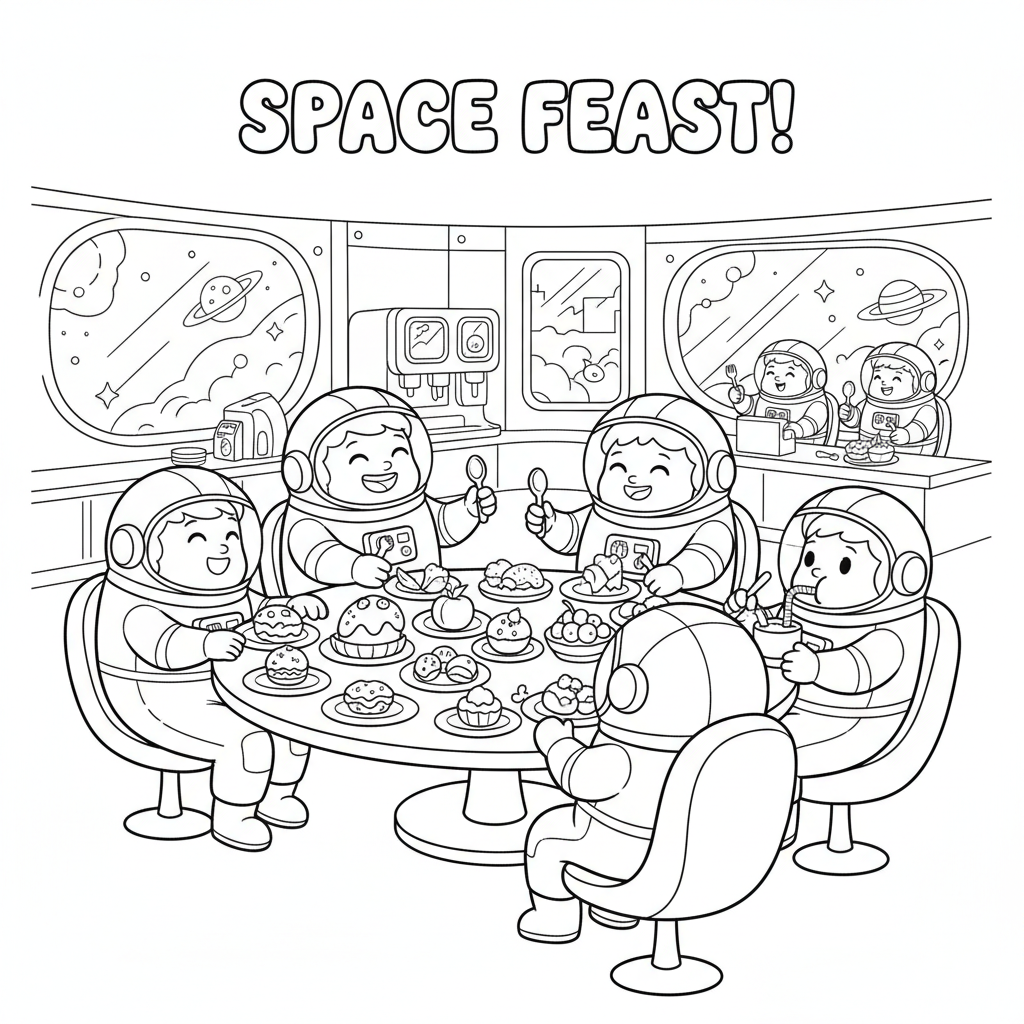 En original AI-genererad fan art-målarbok inspirerad av Among Us, med färgglada bönformade astronauter i cafeterian som äter tillsammans. Detta är inofficiell fan art, inte ansluten till de ursprungliga skaparna. Perfekt för barn och vuxna som älskar att färglägga!