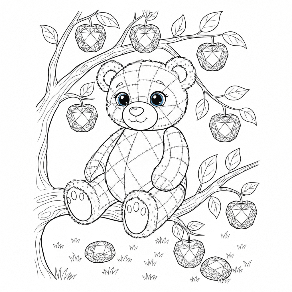 En quiltad teddybjörn med blå ögon och lurviga fötter sitter i ett äppelträd med safirkristall ap
