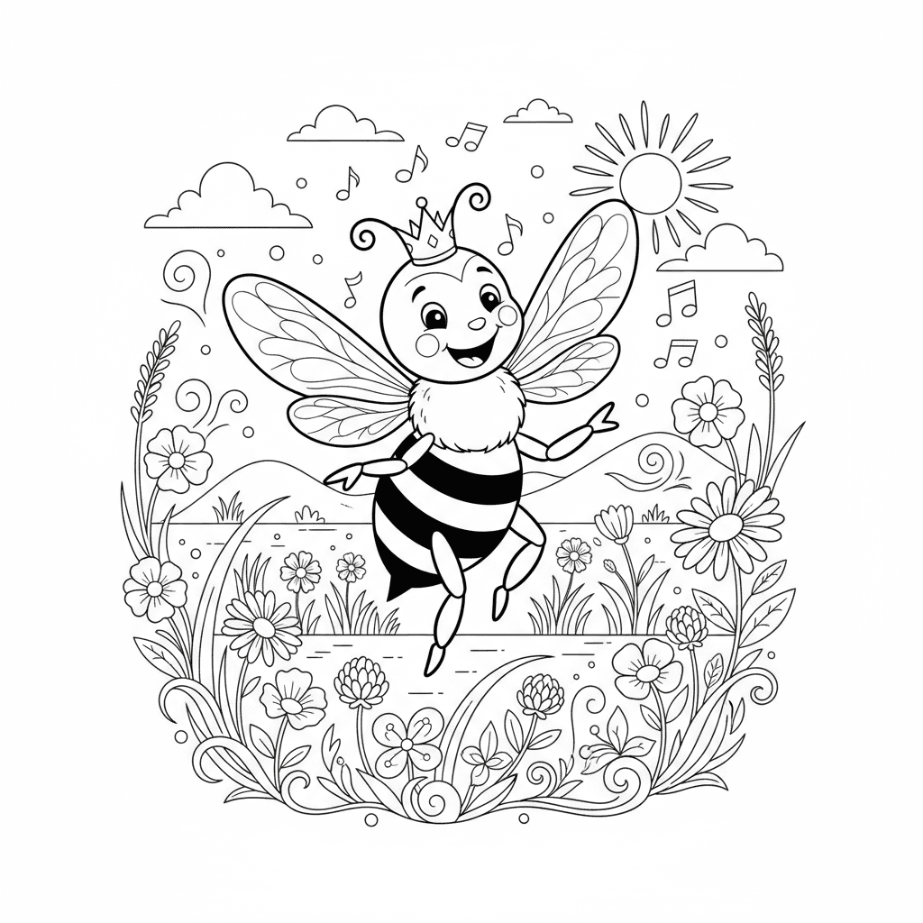 Vackert dansande bi på äng målarbok för barn och vuxna. Gratis att ladda ner och skriva ut.