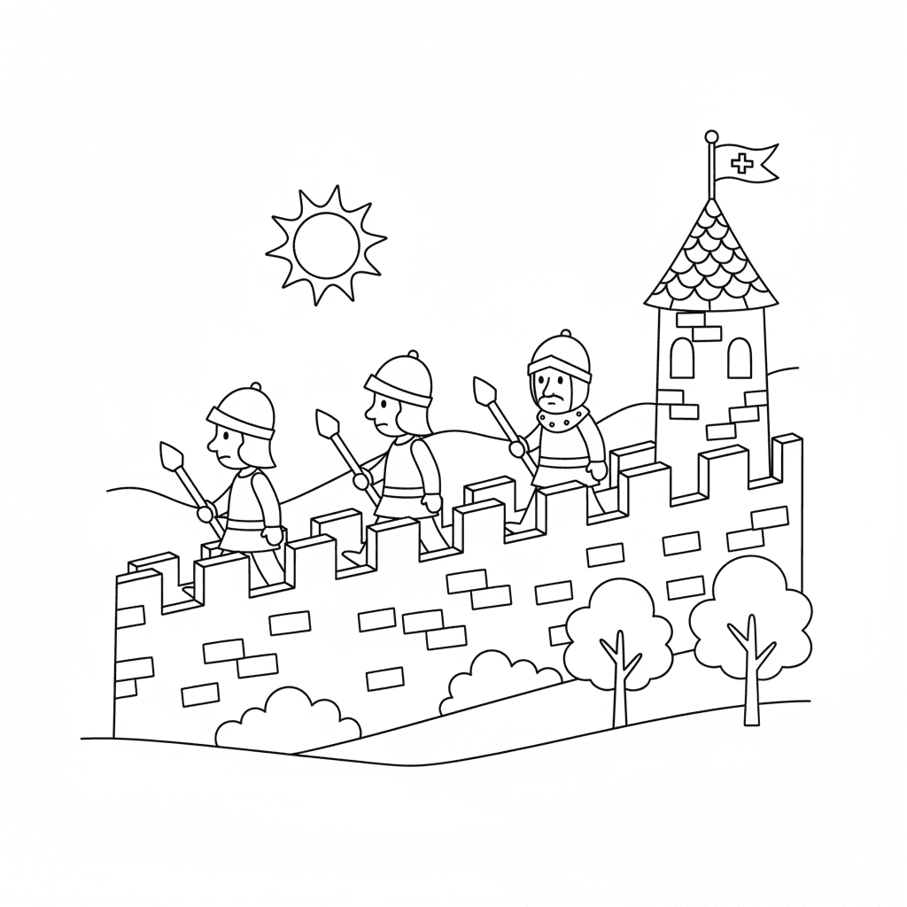 En härlig slottsmålarbok med patrullerande vakter som går längs slottsmuren. Perfekt för barn och vuxna som älskar att färglägga!
