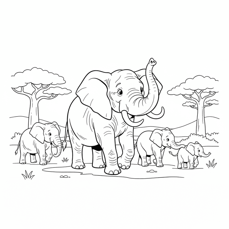 En härlig elefantmålningssida med elefantmatriark som leder flocken klokt. Perfekt för barn och vuxna som älskar att färglägga!
