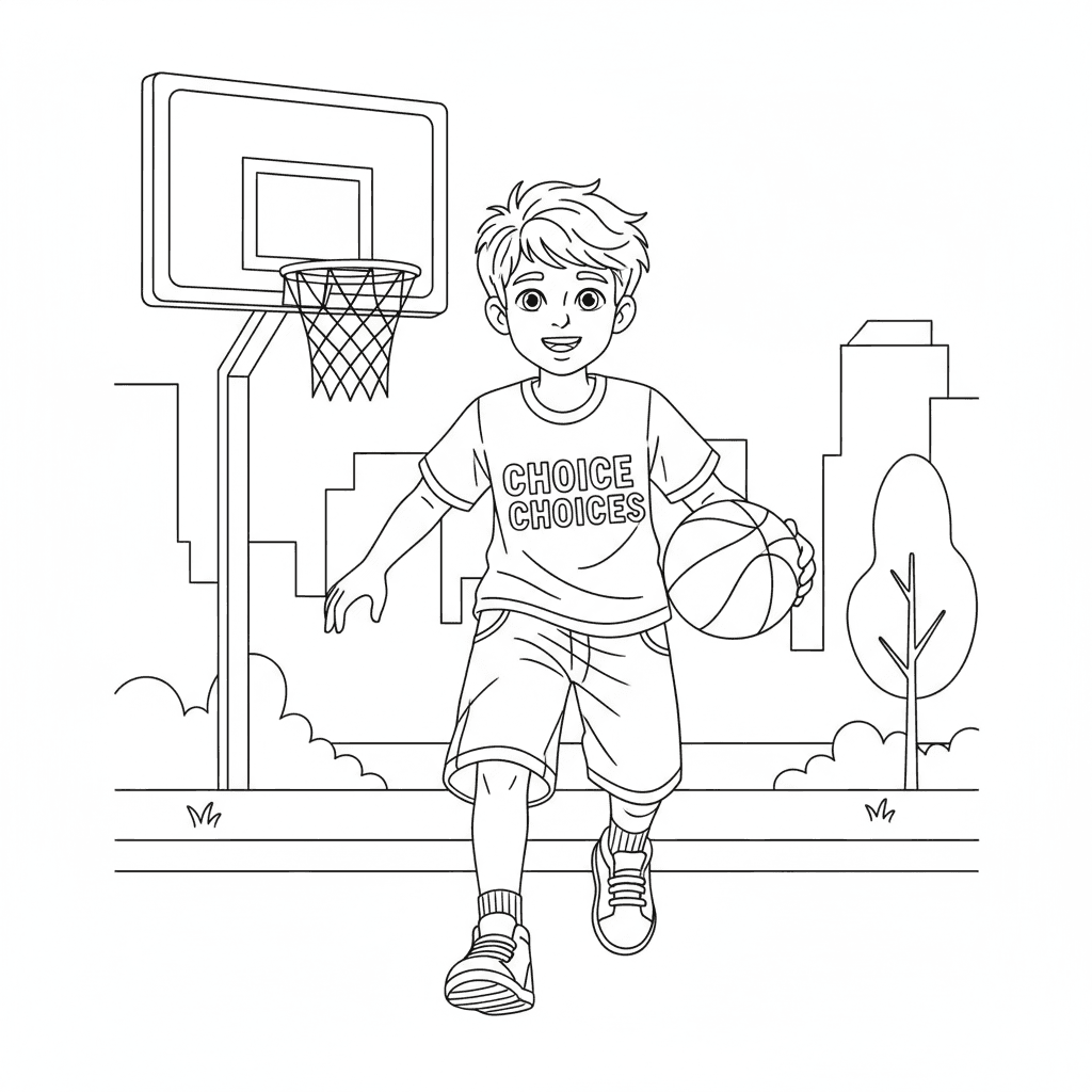 En 12-årig pojke med ordet choices på sin tröja spelar basket
