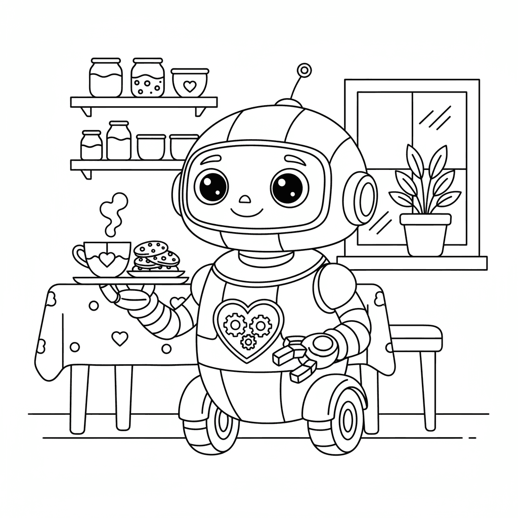 Vacker vänlig robothjälpare färgläggningssida för barn och vuxna. Gratis att ladda ner och skriva ut.