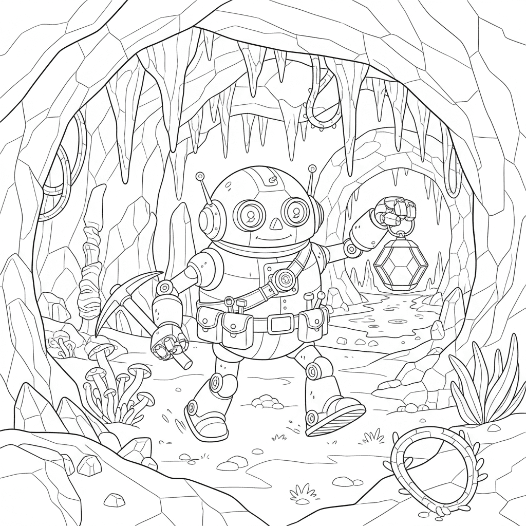 Vacker robotutforskare grotta färgläggningssida för barn och vuxna. Gratis att ladda ner och skriva ut.