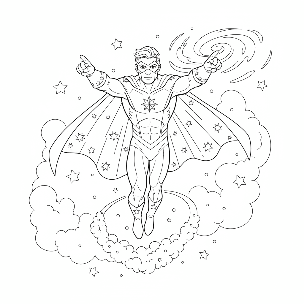 Vacker stjärna superhjälte flygande målarbok för barn och vuxna. Gratis att ladda ner och skriva ut.