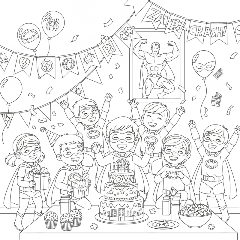 Vacker superhjälte födelsedagsfest färgsida för barn och vuxna. Gratis att ladda ner och skriva ut.