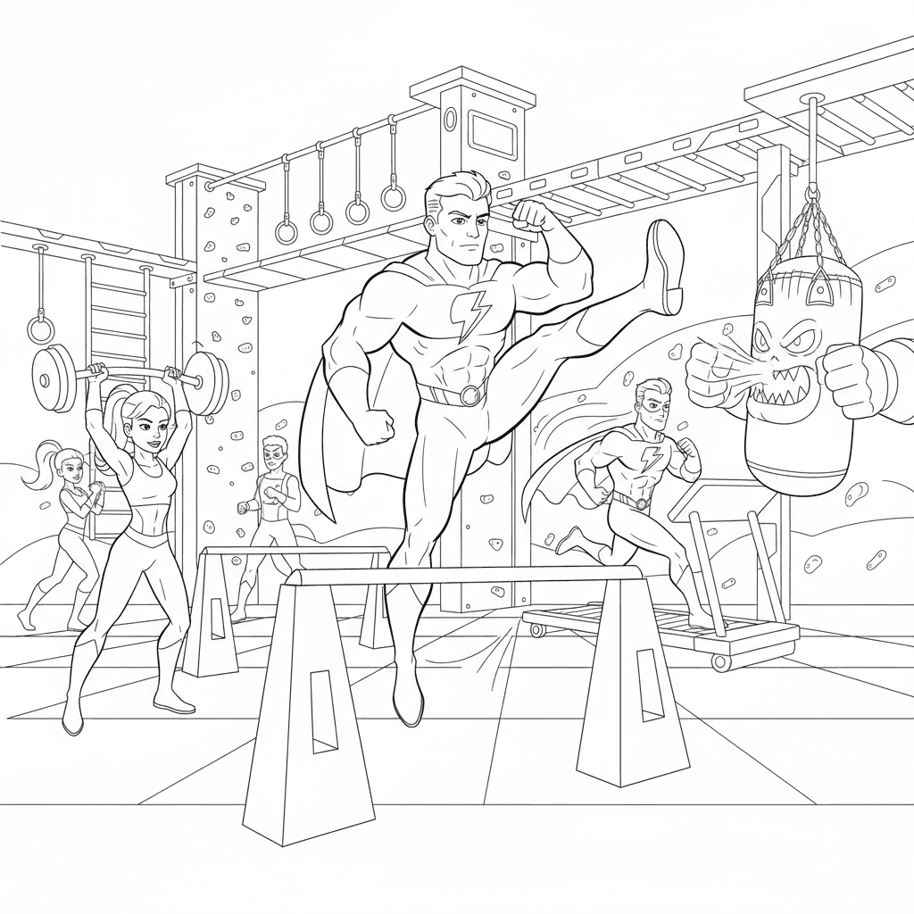 Vacker superhjälteträningsträningsmålningssida för barn och vuxna. Gratis att ladda ner och skriva ut.